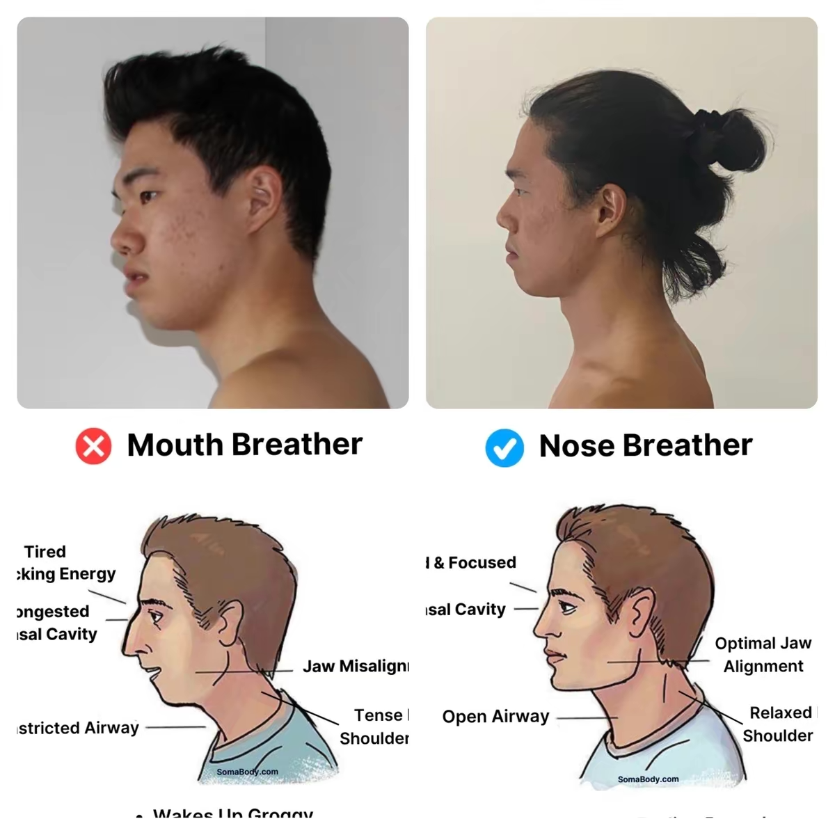 Not only that, studies show that mouthbreathing leads to things like deformities of your oral and facial structure, sleep issues including sleep apnea, and lower stamina due to decreased oxygen intake.